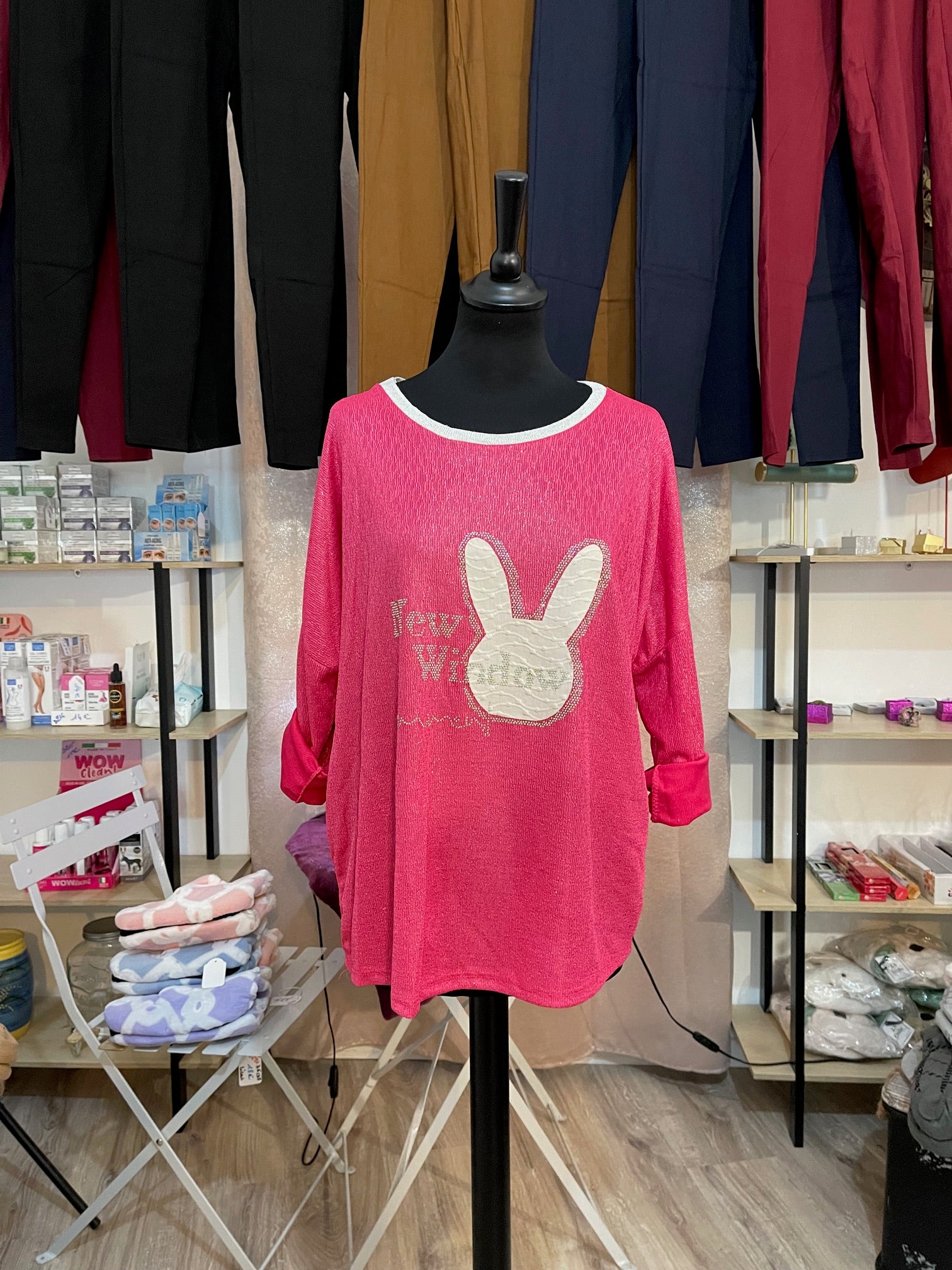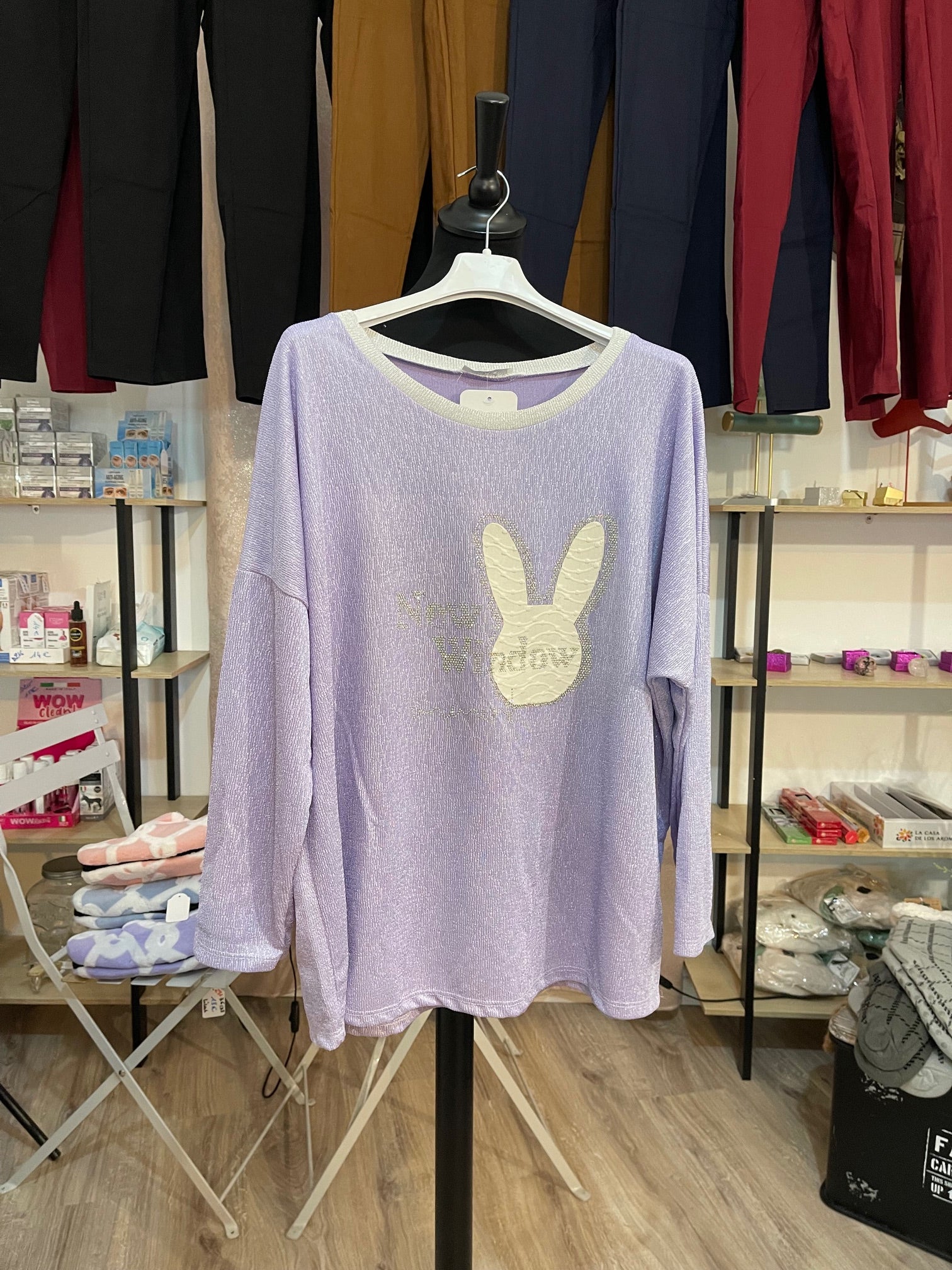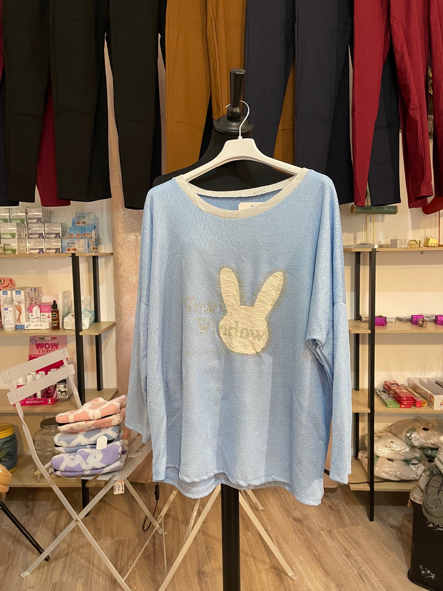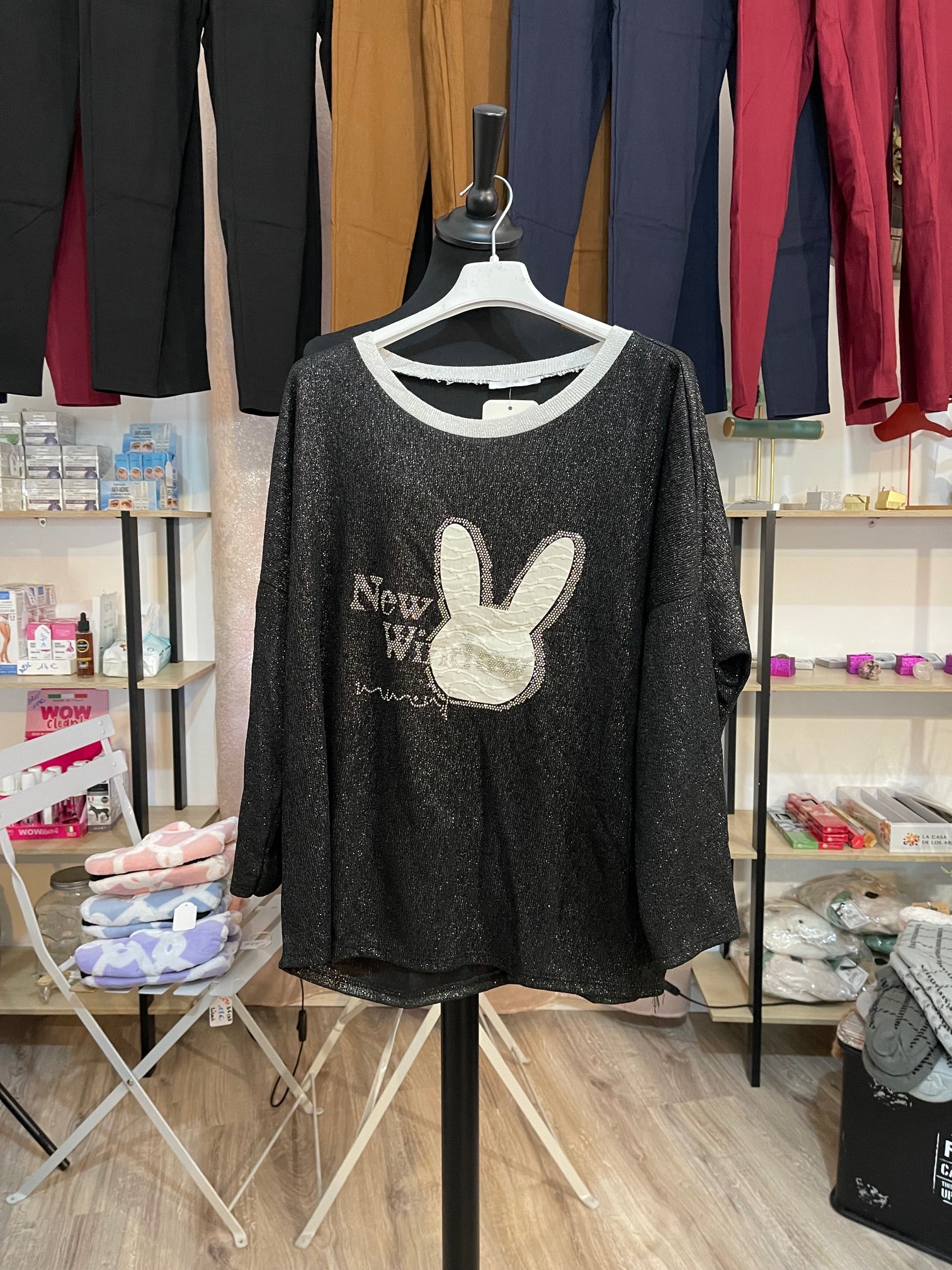 Col Rond manches longues effet pailleté avec motif lapin et strass