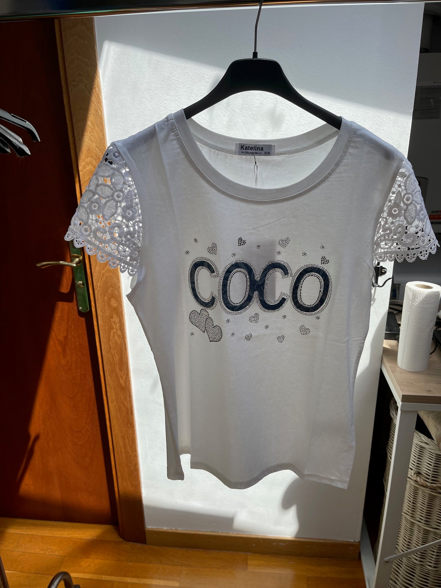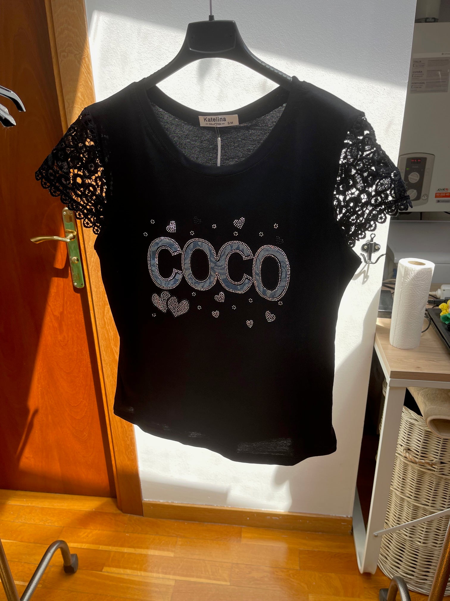 Col Rond manches courtes en dentelle imprimé COCO avec strass